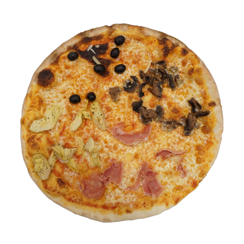 Pomodoro, mozzarella, funghi, carciofi, prosciutto, olive