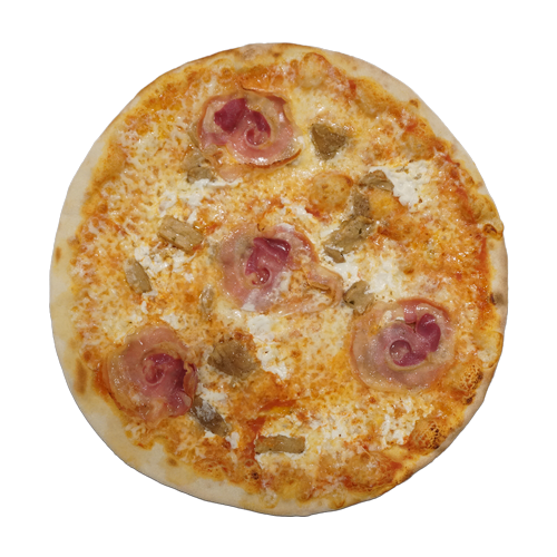 Pomodoro, mozzarella, porcini, panna, pancetta dolce