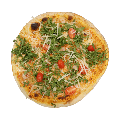 Pomodoro, mozzarella, pomodorini, gamberetti*, grana a scaglie, rucola