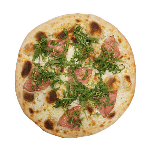 Bianca con mortadella, granella di pistacchio, bufala e rucola