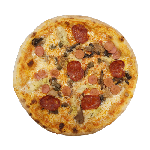Pomodoro, mozzarella, funghi, carciofi, prosciutto, würstel, peperoni, uovo