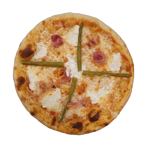Pomodoro, mozzarella, asparagi, pancetta e panna