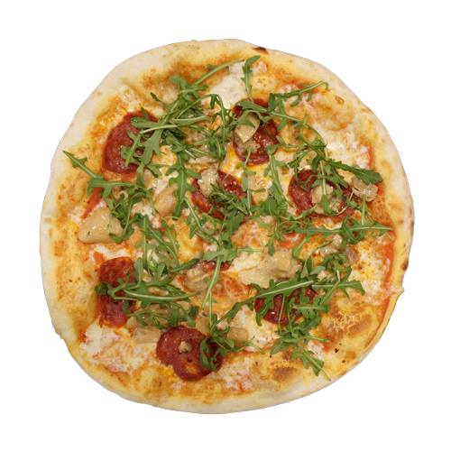 Pomodoro, mozzarella, salame piccante, porcini, rucola, peperoncino