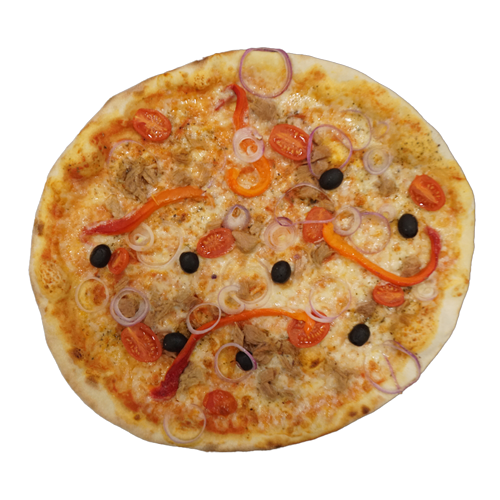 Pomodoro, mozzarella, tonno, pomodorini, peperoni, cipolla, olive, origano