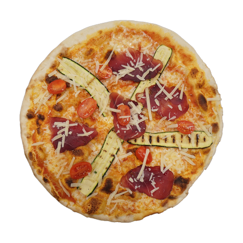Pomodoro, mozzarella, pomodorini, zucchine, crudo di cinghiale, grana a scaglie